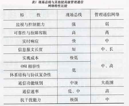 現(xiàn)場(chǎng)總線處于信息/控制網(wǎng)絡(luò)最低層,雖然傳輸信息量不是很大,但要求實(shí)時(shí)性好,可靠性高,而且網(wǎng)絡(luò)接口盡可能簡(jiǎn)單,成本盡量降低?,F(xiàn)場(chǎng)總線與其他較高級(jí)管理通信網(wǎng)絡(luò)特性的比較見(jiàn)表1。