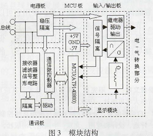 采用模塊化的設(shè)計(jì)思想,將整個(gè)設(shè)計(jì)分為功能相對(duì)獨(dú)立的五個(gè)模塊:電源板、通信板、MCU板、輸入輸出板和顯示板。其中電源板、通信板、MCU板和顯示板是通用的。在設(shè)計(jì)諸如溫度變送器、現(xiàn)場(chǎng)總線(xiàn)-電流轉(zhuǎn)換器等其他基于WorldFIP現(xiàn)場(chǎng)總線(xiàn)協(xié)議的智能儀表時(shí),這些相對(duì)獨(dú)立的模塊可以不加任何改動(dòng)直接使用,從而縮短開(kāi)發(fā)周期??傮w結(jié)構(gòu)如圖3所示。
