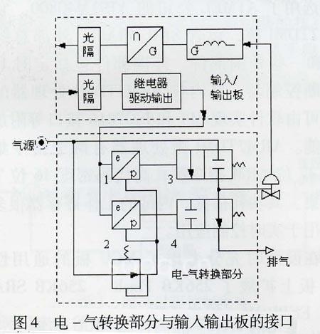 非接觸電感位移傳感器檢測(cè)閥門(mén)的位移大小,通過(guò)轉(zhuǎn)換器經(jīng)隔離后將其送入微控制器。微控制器將其與設(shè)定值進(jìn)行比較,根據(jù)它們的偏差來(lái)決定開(kāi)/關(guān)閥3和4的狀態(tài)(開(kāi)或關(guān)),從而向調(diào)節(jié)閥進(jìn)氣或從調(diào)節(jié)閥排氣,實(shí)現(xiàn)調(diào)節(jié)閥的精確定位。任一時(shí)刻開(kāi)關(guān)閥3和4,只能有一個(gè)開(kāi)通,另一個(gè)關(guān)閉。開(kāi)關(guān)閥3開(kāi)通時(shí),壓縮空氣迸入調(diào)節(jié)閥;開(kāi)關(guān)閥4開(kāi)通時(shí),調(diào)節(jié)閥氣室內(nèi)的壓縮空氣進(jìn)4排入大氣。電-氣轉(zhuǎn)換部分與輸入輸出板的接口如圖4所示。