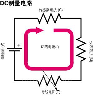 基本的DC測(cè)量電路由電源和三個(gè)電阻:傳感器輸出電阻、傳輸線(引線)電阻和儀表電阻構(gòu)成。唯一將這些連接在一起的是電路中的電流。當(dāng)進(jìn)行測(cè)量時(shí),您真正記錄的數(shù)值是由儀表電阻所引起的環(huán)路電流電壓降。