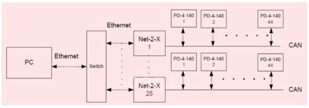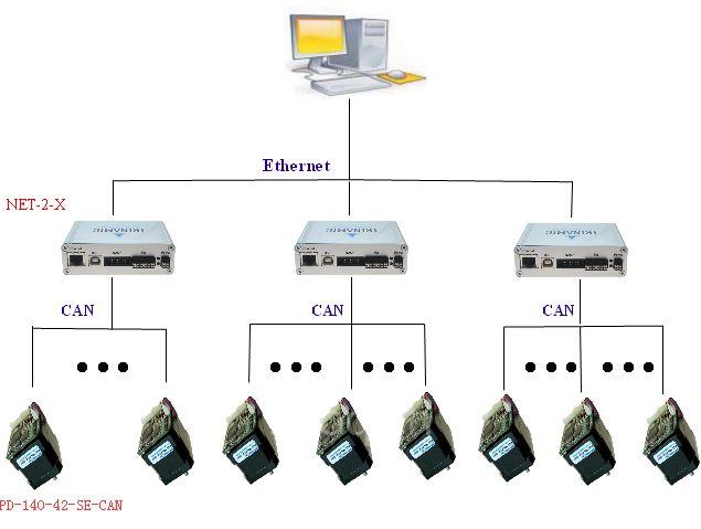 整個(gè)網(wǎng)路結(jié)構(gòu)十分清晰,主要有Ethernet轉(zhuǎn)CAN的NET-2-X和PD-140-42-SE-CAN(支持CAN總線的控制+驅(qū)動(dòng)+電機(jī)+反饋)