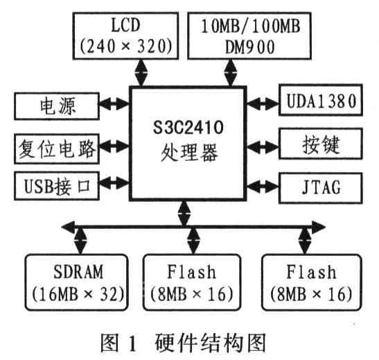 S3C2410內(nèi)部集成有ARM920T內(nèi)核和常用外圍組件。由于它是一款專為手持設(shè)備設(shè)計(jì)的低功耗處理器.因此可以降低手持設(shè)備成本,具有較高的性價(jià)比。該系統(tǒng)采用模塊化設(shè)計(jì)思想,依據(jù)功能可劃分為網(wǎng)絡(luò)、存儲(chǔ)、解碼、觸摸屏、按鍵、電源、USB接口、UART接口等模塊。其硬件結(jié)構(gòu)如圖1所示。