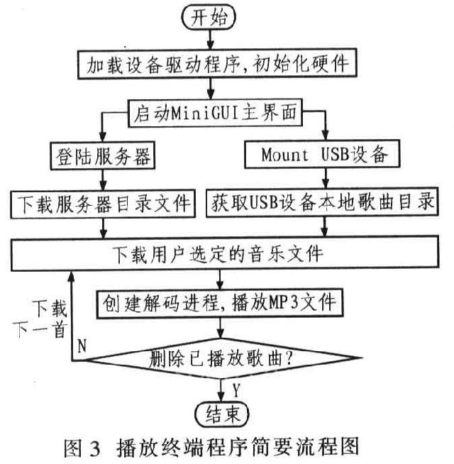 應(yīng)用程序負(fù)責(zé)與服務(wù)器網(wǎng)絡(luò)通信,向服務(wù)器發(fā)送請(qǐng)求、下載歌曲、播放歌曲,并對(duì)整個(gè)播放過程進(jìn)行控制管理。通過240x320TFT觸摸式彩屏LCD把信息呈現(xiàn)給用戶,用戶可通過觸摸屏和按鍵向系統(tǒng)發(fā)送請(qǐng)求。系統(tǒng)播放終端程序簡(jiǎn)要流程見圖3。