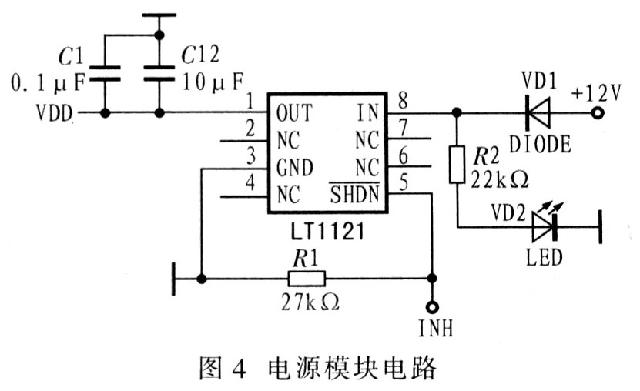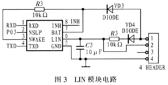 本設(shè)計(jì)中,LIN模塊的電壓調(diào)節(jié)器均采用微功耗、低壓差穩(wěn)壓器LTll2l一5。選用LTl121—5通過對(duì)SHDN輸入低電平,能使其進(jìn)入停止模式,這時(shí)靜態(tài)電流只有16μA,因此在總線上沒有活動(dòng)時(shí),就能達(dá)到減少功耗的目的;此外,該器件還具有防止輸入和輸出電源反向的功能,即使在輸出端不增加二極管的情況下,也能防止電流反向倒流。圖4給出電源模塊電路。