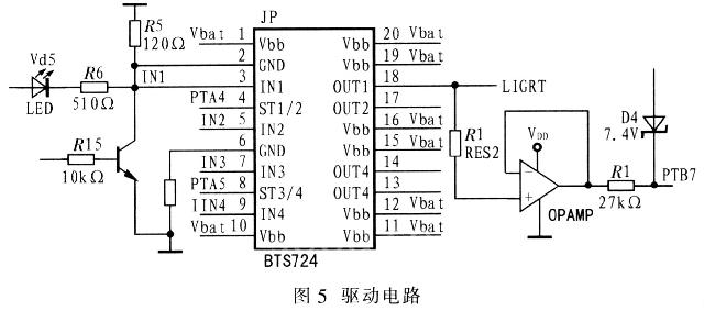 采用功率驅(qū)動(dòng)器BTS724G來驅(qū)動(dòng)2l W和5 W的車燈。該驅(qū)動(dòng)器是英飛凌公司設(shè)計(jì)的N溝道MOSFET功率管,內(nèi)部集成了充電泵、電流驅(qū)動(dòng),并具有檢測(cè)負(fù)載電流(包括過載、過溫和短路)故障反饋功能。BTS724G采用12 V或24 V負(fù)載控制,適用于各種阻性、感性或容性負(fù)載,尤其適用于車燈等具有高浪涌電流的負(fù)載,可作為繼電器、保險(xiǎn)絲等的替代控制方法。BTS724G還具有短路保護(hù)、過載保護(hù)、過壓保護(hù)、過溫關(guān)斷、掉地和掉電保護(hù)、靜電放電保護(hù)和電源反接保護(hù)等多項(xiàng)保護(hù)功能。圖5給出驅(qū)動(dòng)電路。
