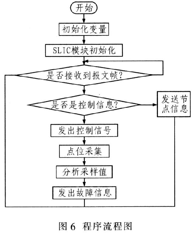LIN信息的接收采用中斷方式,當(dāng)MC68HC90—8Q14控制器檢測(cè)到符合該節(jié)點(diǎn)要求的信息幀后,首先判斷本地節(jié)點(diǎn)接收到的是什么信息幀,若為控制信息,則接收2個(gè)字節(jié)的數(shù)據(jù)信息;若為查詢信息,則將本地節(jié)點(diǎn)車燈的狀態(tài)以信息幀的形式發(fā)送回主節(jié)點(diǎn),以反映節(jié)點(diǎn)情況。然后判斷,若為接收數(shù)據(jù)幀,則在SLIC模塊中的數(shù)據(jù)寄存器(SLCDx)上讀取相應(yīng)的信息。最后是根據(jù)數(shù)據(jù)信息中相關(guān)的位進(jìn)行車燈控制,在發(fā)出控制信號(hào)后地相應(yīng)采集車燈驅(qū)動(dòng)芯片輸入、輸出和故障診斷引腳的電位,通過對(duì)電位的分析判斷否發(fā)生故障,若發(fā)生故障則發(fā)送一個(gè)故障信息。圖6給出程序流程圖。