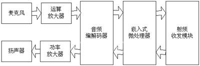 語音的無線傳輸以嵌入式微處理器和射頻收發(fā)模塊為核心,輔以外部的放大器、濾波電路、音頻編解碼器來實(shí)現(xiàn),總體結(jié)構(gòu)如圖1所示。
