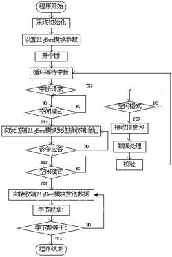 在系統(tǒng)軟件設(shè)計(jì)時(shí),節(jié)點(diǎn)采用串口通信模式,利用中斷的方法完成數(shù)據(jù)的接收和發(fā)送。數(shù)據(jù)的傳送采用主從節(jié)點(diǎn)方式,利用USB接口實(shí)現(xiàn)與PC通信。要發(fā)送的數(shù)據(jù)按照Zigbee協(xié)議規(guī)定的最大幀長度打包,加上網(wǎng)絡(luò)層、媒質(zhì)訪問控制層和物理層的幀頭,將數(shù)據(jù)通過SPI總線,按用戶要求發(fā)送到接收端的射頻收發(fā)模塊。當(dāng)從節(jié)點(diǎn)向主節(jié)點(diǎn)發(fā)送中斷請求時(shí),自動(dòng)轉(zhuǎn)入中斷服務(wù)子程序?qū)崿F(xiàn)接收信息包和數(shù)據(jù)處理。本系統(tǒng)數(shù)據(jù)的發(fā)送和接收流程如圖5所示。