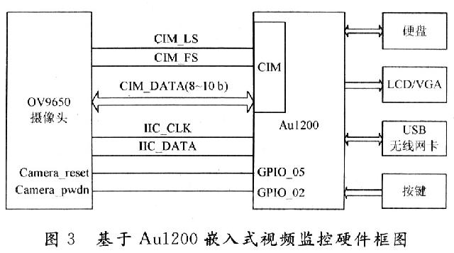 (1)視頻監(jiān)控輸入部分:采用Omni Vision公司的彩色CMOS圖像傳感器OV9650作為系統(tǒng)的視頻輸入設(shè)備,利用Au1200自帶的CIM(Camera Interface Module)接口,可以方便地控制OV9650。通過I2C方式,配置OV9650攝像頭的工作模式,通過CIM接口讀入采集到的視頻數(shù)據(jù),并映射到內(nèi)存單元中。根據(jù)不同流向需求,處理視頻數(shù)據(jù)流,實(shí)現(xiàn)系統(tǒng)的錄制、存儲(chǔ)、播放、傳送等功能。