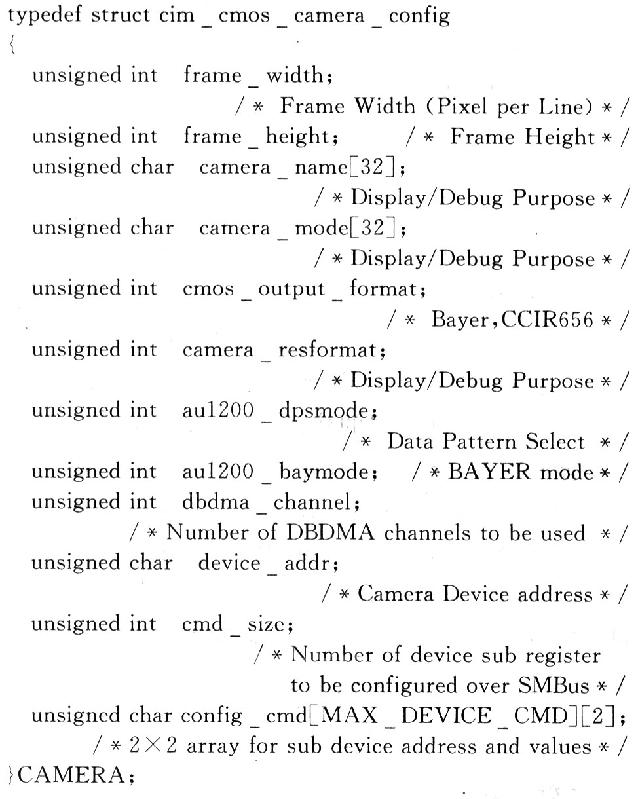在攝像頭驅(qū)動(dòng)中,定義數(shù)據(jù)結(jié)構(gòu)cim_cmos_cam-era_config對(duì)攝像頭設(shè)備進(jìn)行描述: