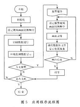 應(yīng)用程序是處在應(yīng)用層的上層軟件,他面向用戶提供人機(jī)會(huì)話界面,并實(shí)現(xiàn)各種功能,用戶通過(guò)應(yīng)用程序?qū)υO(shè)備實(shí)施控制。應(yīng)用程序使用最常用的Microsoft VisualC++6.O開(kāi)發(fā)環(huán)境進(jìn)行開(kāi)發(fā)編譯,主要分成2個(gè)子程序:一是操作臺(tái)程序(OPERATION.C)。控制視頻畫面切換,提供人機(jī)交互,通過(guò)調(diào)用winDriver工具軟件生成的驅(qū)動(dòng)程序提供的一些間接控制設(shè)備硬件的接口函數(shù),實(shí)現(xiàn)USB通信功能;二是報(bào)警處理程序(ALARM.C)。處理單片機(jī)報(bào)警信號(hào),調(diào)用數(shù)據(jù)庫(kù)文件,向使用者提供智能化處置預(yù)案。程序流程如圖5所示。