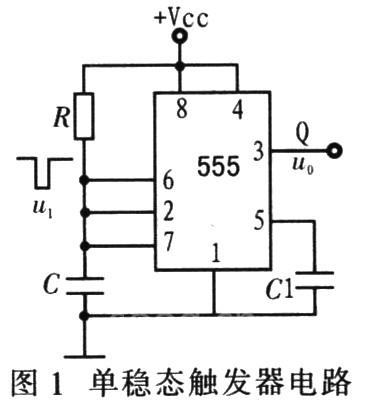 電路中只有一種穩(wěn)定工作狀態(tài)的觸發(fā)器叫做單穩(wěn)態(tài)觸發(fā)器,其特點:在無外加觸發(fā)信號作用時,電路處于一種穩(wěn)定工作狀態(tài),稱為穩(wěn)態(tài);當(dāng)輸入端有外加觸發(fā)脈沖信號的上升沿或下降沿(由電路而定)作用時,輸出狀態(tài)立即發(fā)生跳變。電路進入暫時穩(wěn)態(tài)狀態(tài),稱為暫穩(wěn)態(tài)。電路自動恢復(fù)原先的穩(wěn)態(tài),其暫穩(wěn)態(tài)時間與電路閾值電壓及外接R、C參數(shù)有關(guān)。按電路結(jié)構(gòu),單穩(wěn)態(tài)觸發(fā)器可分為微分型和積分型兩種。前者適用于窄脈沖觸發(fā),后者適用于寬脈沖觸發(fā)。無論哪種電路結(jié)構(gòu),其單穩(wěn)態(tài)的產(chǎn)生都源于電容的充放電原理。圖1為用555定時器組成的單穩(wěn)態(tài)觸發(fā)器電路。