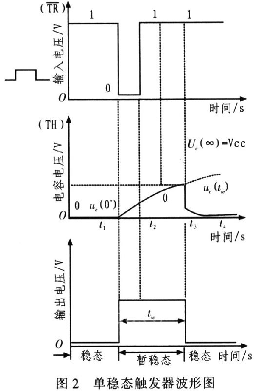 用555定時器組成的單穩(wěn)態(tài)觸發(fā)器,圖2為其波形圖。圖中,t0~t1為穩(wěn)態(tài),t1~t3為暫穩(wěn)態(tài),t3時刻恢復(fù)穩(wěn)態(tài)。
