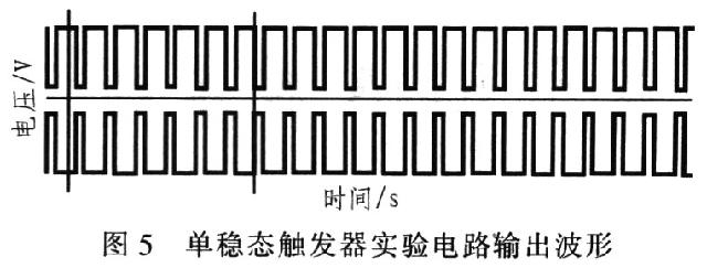 圖4為仿真單穩(wěn)態(tài)觸發(fā)器實驗電路,圖5為示波器輸出波形。在圖4的電阻、電容取值下,移動示波器的1、2兩個游標測得暫穩(wěn)態(tài)的維持時間為550.702 1μs,利用公式計算:TW=1.1RC=550μs,實驗結(jié)果與理論計算結(jié)果基本一致。