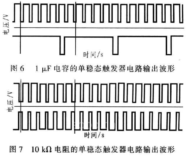 由上述可知,555定時器組成的單穩(wěn)態(tài)電路由輸入脈沖信號的下降沿觸發(fā),使其輸出狀態(tài)產(chǎn)生翻轉(zhuǎn),另外,在暫穩(wěn)態(tài)過程結(jié)束前,u1必須恢復(fù)為1,否則電路內(nèi)的RS觸發(fā)器為不確定狀態(tài),輸出不能維持0狀態(tài)。因此這種單穩(wěn)態(tài)電路只能用負窄脈沖觸發(fā)。如果輸入脈寬大于輸出脈寬,則輸入端可加RC微分電路,使輸入脈寬變窄。