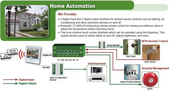 威強(qiáng)采用帶有RFID技術(shù)的平板電腦作為智能家居系統(tǒng)的主控電腦。通過RFID自動識別技術(shù)及遠(yuǎn)程網(wǎng)絡(luò),使業(yè)主可以對自己住所進(jìn)行遠(yuǎn)程控制,通過數(shù)字I/0接口來控制門鎖,暖氣,防盜及防火警鈴等電子系統(tǒng)開啟。并通過RS-485協(xié)議來控制家庭影視播放系統(tǒng)。