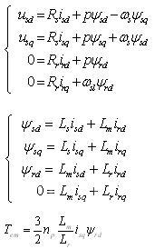 異步電機(jī)本質(zhì)上是一個(gè)高階、非線性、強(qiáng)耦合的多變量系統(tǒng),由于電機(jī)內(nèi)部各個(gè)量的耦合性的存在,直接控制電機(jī)的三相輸入電壓電流的方法得到的結(jié)果并不令人滿意。經(jīng)過(guò)合適的坐標(biāo)變換,電機(jī)內(nèi)部電流將會(huì)得到解耦,電機(jī)的模型將被大大簡(jiǎn)化。在常用的磁場(chǎng)定向矢量控制系統(tǒng)中,一般使d-q坐標(biāo)系中的d軸與轉(zhuǎn)子磁場(chǎng)方向重合,此時(shí)轉(zhuǎn)子磁通q軸分量為零,在此坐標(biāo)系內(nèi)電機(jī)模型如下: