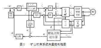 由上面矢量控制的原理可知,異步電機(jī)的矢量控制系統(tǒng)就是先對(duì)實(shí)際電機(jī)的三相坐標(biāo)系下的物理量進(jìn)行變換,在變換后的坐標(biāo)系下對(duì)電機(jī)的磁鏈和轉(zhuǎn)矩分別控制,確定控制給定量,然后再經(jīng)過(guò)反變換變換至實(shí)際三相坐標(biāo)系系統(tǒng)對(duì)電機(jī)進(jìn)行控制的過(guò)程。針對(duì)前面所提到的礦山機(jī)車牽引電機(jī)的工作特點(diǎn),應(yīng)該在傳統(tǒng)的矢量控制中加入轉(zhuǎn)速估算和弱磁控制環(huán)節(jié)。綜合考慮礦山機(jī)車系統(tǒng)的特殊要求本系統(tǒng)結(jié)構(gòu)框圖如圖1所示。