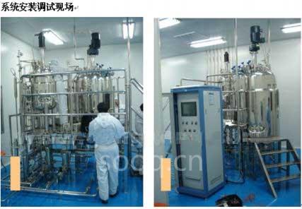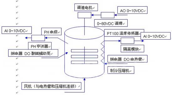 1.系統(tǒng)概述: 智能式生物發(fā)酵系統(tǒng)要求強(qiáng)大的自動控制功能、可擴(kuò)展性強(qiáng)、操作靈活、穩(wěn)定可靠以及故障率低?;究刂茀?shù)為:溫度、攪拌速度、PH、DO、進(jìn)氣流量、罐壓、定時定量流加、連續(xù)發(fā)酵、液位、多種自動補(bǔ)料方式、自動消泡等。特殊分析、控制為:如CO2、密度、糖份、自動滅菌等。 2.系統(tǒng)組成: 1. 發(fā)酵罐 玻璃、不銹鋼 2. 控制系統(tǒng) (1)可編程控制器(整個控制系統(tǒng)的核心組件) (2)傳感器: 溫度傳感器、PH值傳感器、容氧傳感器、壓力傳感器 (3)變送器: 4~20mA變送器(起到信號變送的作用) (4)現(xiàn)場執(zhí)行設(shè)備 變頻器: 控制電機(jī),由AO輸出控制 交流電機(jī): 控制壓縮機(jī),由變頻器控制 蠕動泵: 控制酸堿的加入,由AO輸出控制 3. 本地控制 (1)5.7寸或10.4寸工業(yè)級人機(jī)界面,現(xiàn)場顯示、操作終端 (2)本地監(jiān)控程序,在觸摸屏中運(yùn)行 4.遠(yuǎn)程監(jiān)控 (1)PC電腦 (2)上位組態(tài)軟件 5.其它 (1)電源(2)報警裝置 結(jié)構(gòu)圖: