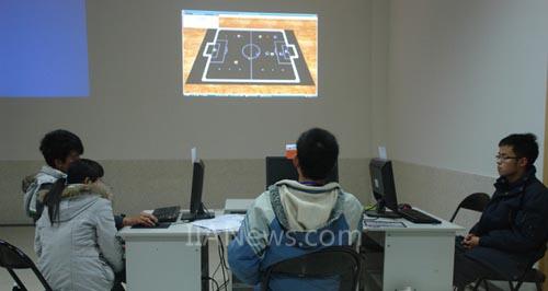 比賽現(xiàn)場,氣氛熱鬧而緊張,這邊,北京大學(xué)與中國人民解放軍陸軍航空兵學(xué)院的機器魚水球比賽進行得如火如荼。兩條約30厘米長的機器魚在球門前爭搶著,一條魚順勢用尾巴一掃,球進了。這些機器魚怎樣贏得比賽呢?來自陸軍航空兵學(xué)院的陳遠志為我們揭開了謎團?!皺C器魚的背部有紅、黃兩個顏色的方形標志,球的顏色是紅色,而比賽場地正中央有一個攝像頭,攝像頭通過感應(yīng)各種顏色的信號指示魚對球作出反應(yīng)?!币粋€小小的機器魚僅僅速度和方向就各有十五個擋位,可想而知,設(shè)計一整場比賽的程序是個多么龐大的工程。