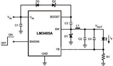 圖1 使用LM3405控制器的MR16 LED燈設(shè)計