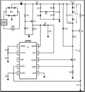 傳統(tǒng)的三端雙向可控硅調(diào)光器通常被設(shè)計成連接電阻負載(鹵素?zé)艋虬谉霟襞荩┑慕涌?。而現(xiàn)在的 LED 驅(qū)動器解決方案與標(biāo)準的壁裝式調(diào)光器相連,要么產(chǎn)生 120 Hz 的 LED 閃爍信號,要么無法實現(xiàn)100:1 的調(diào)光。圖 2 顯示了使用美國國家半導(dǎo)體 LM3445 LED 驅(qū)動器的 220V 交流設(shè)計電路。
