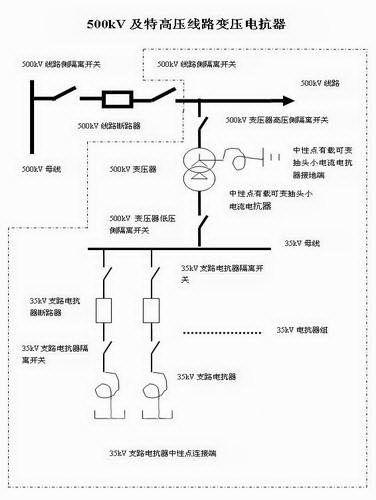 500kV線路變壓電抗器(見下圖)的解決方案是利用500kV變35kV的變壓器,將35kV側(cè)低壓電抗器組的無功功率傳送到500kV高壓側(cè)。同時可利用變壓器中性點的有載可變抽頭小電抗器接地,來補償線路由于單相重合閘引起的潛供電流。在補償了超高壓或特高壓線路的潛供電流后,根據(jù)500kV線路變壓電抗器安裝點的系統(tǒng)無功功率和電壓,通過控制系統(tǒng)控制35kV側(cè)的低壓電抗器組的投切,使得超高壓線路及特高壓線路的無功功率補償度從欠補償擴展到過補償,增加了系統(tǒng)的調(diào)壓手段,提高了系統(tǒng)電壓的運行質(zhì)量,實質(zhì)性的降低了電網(wǎng)的無功和有功損耗。