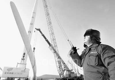 12月10日,重達120噸3兆瓦風力發(fā)電機組在新疆達坂城正式安裝(見圖)。這是目前我國陸上最大功率的風力發(fā)電機組。