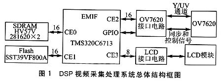 系統(tǒng)結(jié)構(gòu)框圖如圖1所示。DSP采用TI公司發(fā)布的C6000系列高速浮點型信號處理器TMS320C6713,其峰值處理速度達 l350 MFLOPS(百萬次浮點每秒)。其外部存儲器接口EMIF(External Memory Interface)包括4個CE空間,其中 CE0被配置為16位同步空間,接SDRAM;CEl為16位異步空間,接Flash;CE2為16位異步空間,經(jīng)過地址譯碼和總線緩沖將數(shù)字圖像傳感器 OV7620接入;CE3為8位異步空間,經(jīng)過數(shù)據(jù)鎖存和總線隔離將LCD顯示模塊接入。
