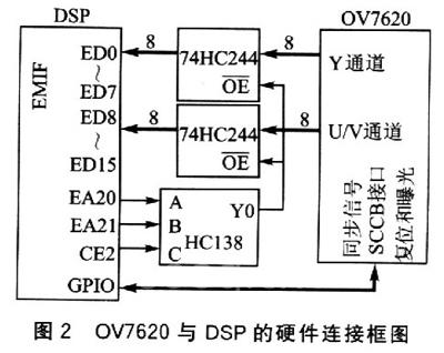 OV7620與DSP的硬件連接框圖如圖2所示。在對OV7620復(fù)位結(jié)束后,DSP通過GPIO模擬SCCB總線完成對OV7620內(nèi)部功能寄存器的配置,之后數(shù)幀內(nèi)圖像數(shù)據(jù)和同步信號將逐漸穩(wěn)定。Y通道和U/V通道在分別經(jīng)過74HC244總線緩沖器之后接入EMIF低16位數(shù)據(jù)總線。 CE2與地址線EA20、EA21經(jīng)過譯碼產(chǎn)生2片74HC244的選通信號,此時OV7620的讀地址為0xA0000000。