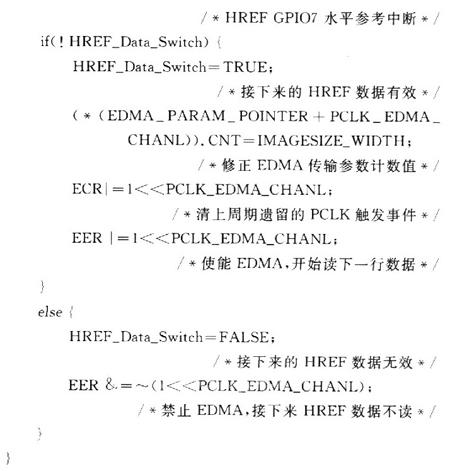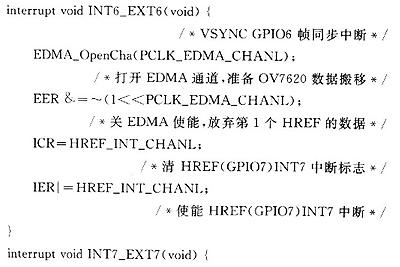 本系統(tǒng)采用EDMA的第12個通道(EDMAl2)進行圖像數(shù)據(jù)采集。該通道被配置為16位一維傳輸方式,中斷禁止,PCLK的上升沿觸發(fā) EDMAl2搬移一個16位數(shù)據(jù)存入到SDRAM中,每次EDMA任務(wù)搬移一個HREF(320個16位)的圖像數(shù)據(jù)。幀同步信號VSYNC上升沿觸發(fā) DSP中斷,對EDMA通道進行初始化,使能水平參考信號HREF中斷并關(guān)閉EDMA通道(放棄第1個HREF、的數(shù)據(jù)),開始一幀的數(shù)據(jù)傳輸。HREF 下降沿觸發(fā)DSP產(chǎn)生中斷,標志OV7620一次HREF數(shù)據(jù)輸出的結(jié)束。如果接下來一次HREF數(shù)據(jù)需要被讀入,則中斷服務(wù)程序會對EDMAl2參數(shù)進行修正,使能EDMA12通道,開始下一行數(shù)據(jù)的傳輸;否則,就禁止EDMAl2,放棄下一次HREF數(shù)據(jù)。每接收1幀圖像數(shù)據(jù)共產(chǎn)生240次HREF中斷和120次EDMA數(shù)據(jù)傳輸。以下是OV7620數(shù)據(jù)采集的部分源代碼: