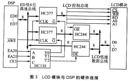 本系統(tǒng)采用了數(shù)據(jù)鎖存和總線緩沖的方法,通過377鎖存器模擬低速總線控制信號時序,利用244數(shù)據(jù)緩沖器對低速總線數(shù)據(jù)進行隔離。圖3給出了DSP與LCD模塊硬件連接圖。系統(tǒng)有2片74HC377(簡稱為“377”),一片用來鎖存模擬LCD模塊的讀寫控制信號(控制377),另一片用來鎖存寫入數(shù)據(jù)(數(shù)據(jù)377),由異步寫使能控制線AWE作為377的觸發(fā)沿輸入;CE3和EA20、EA21經(jīng)過譯碼產(chǎn)生2個377的使能信號,DSP寫數(shù)據(jù)377的地址為0xB0000000,寫控制377的地址為0xB0040000。數(shù)據(jù)377的輸出經(jīng)一片總線緩沖器HC244(寫出 244,HC244簡稱為“244”)連接到LCD模塊總線上,該244輸出使能信號來自控制377。另有一片HC244(讀入244)用來將LCD模塊總線接到DSP低8位總線上,其輸出使能信號同樣由CE3和EA20、EA21經(jīng)過譯碼產(chǎn)生,地址為0xB0080000,是DSP對LCD模塊的讀地址。