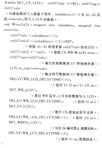 DSP根據(jù)LCD模塊總線時序,通過定時器延時中斷來間隔地寫入數(shù)據(jù)到控制377,以模擬相應(yīng)低速總線的控制信號,并適時從讀入244讀取數(shù)據(jù)(讀周期),或者寫入數(shù)據(jù)到數(shù)據(jù)377(寫周期),就可以完成對LCD模塊的讀/寫操作。LCD寫周期驅(qū)動例程如下(該程序通過延時來控制時間間隔):