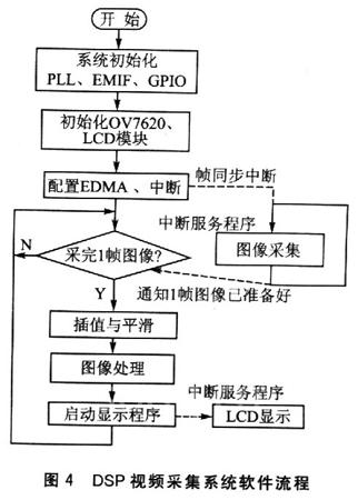 軟件系統(tǒng)流程如圖4所示。DSP在復(fù)位完成之后首先進行系統(tǒng)的初始化,配置鎖相環(huán)、EMIF和GPIO,并硬件復(fù)位OV7620,通過GPIO 模擬SCCB總線配置其內(nèi)部功能寄存器,之后對LCD模塊清屏。當(dāng)EDMA沒有被使能時,OV7620的同步信號仍能被EDMA事件寄存器捕獲并保持,所以把EDMA的初始化放在OV7620和LCD模塊的初始化之后,并在使能之前清事件標志。在中斷被使能之后,OV7620的幀同步信號會觸發(fā)系統(tǒng)中斷,開始進行數(shù)據(jù)的循環(huán)采集,并在每幀數(shù)據(jù)采集完成之后置位相應(yīng)標志,通知主程序進行處理。主程序在接到通知后對OV7620的原始數(shù)據(jù)進行插值和平滑,生成待處理的RGB24位色圖像數(shù)據(jù)。圖像處理和運算的結(jié)果被送到LCD模塊進行動態(tài)顯示,LCD的顯示任務(wù)主要由中斷服務(wù)程序完成,而此時主程序已開始等待和處理下一幀圖像。