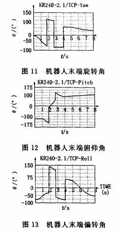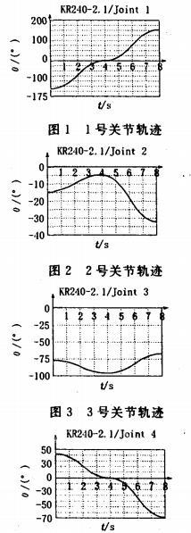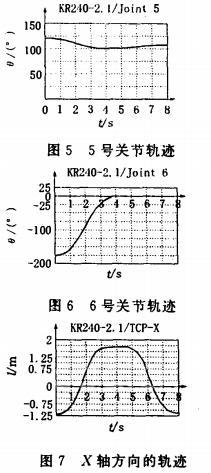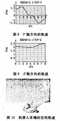 本文以KUKA240—2型搬運(yùn)機(jī)器人為研究對(duì)象,對(duì)機(jī)器人的運(yùn)動(dòng)采用DELMIA/IGRIP進(jìn)行了分析,得到機(jī)器人各關(guān)節(jié)的軌跡,如圖1~圖6所示,機(jī)器人末端的運(yùn)動(dòng)軌跡,如圖7~圖9所示,機(jī)器人末端的空間軌跡如圖10所示。