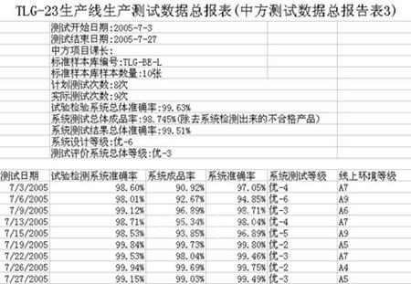 在生產(chǎn)線的工業(yè)網(wǎng)絡上還有其它自動化生產(chǎn)設備,CVS和PXI構成的檢測系統(tǒng)可以和它們無縫連接,在整個的測試過程中可以保證實現(xiàn)實時在線檢測,這樣不僅省去了以前耗時復雜的檢測過程,大大的提高了生產(chǎn)效率,目前TLG-23的產(chǎn)量由以前的單生產(chǎn)線100張/天提高到了835張/天。同時檢測的準確率也大大提高,圖3是近期的生產(chǎn)測試報告,從檢測的結果分析其完全符合實際生產(chǎn)需要,達到了設計要求。