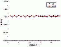 連續(xù)工作試驗是指將自動調(diào)零伺服傾角傳感器通電使之連續(xù)工作24小時,并在每隔1小時時記錄其數(shù)據(jù)輸出V0、V180和Vout的值。根據(jù)連續(xù)工作試驗記錄可以畫出其連續(xù)工作的輸出變化圖,如圖7所示。