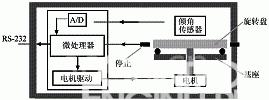 根據(jù)上面提出的自動調(diào)零的理論基礎(chǔ),要實現(xiàn)傾角傳感器的自動調(diào)零,傾角傳感器需要精確旋轉(zhuǎn)180o。經(jīng)過對各種微的比較,選用易于進(jìn)行精確控制的步進(jìn)來實現(xiàn)平臺的旋轉(zhuǎn),然后將傾角傳感器精確地安裝在此平臺上。傾角傳感器在兩個相反位置上的讀數(shù)需要用足夠位數(shù)、精度和響應(yīng)速度的A/D轉(zhuǎn)換器進(jìn)行轉(zhuǎn)換,最后利用單片機存儲和計算最終結(jié)果。其數(shù)字輸出結(jié)果通過RS-232或者形式進(jìn)行輸出,如圖3所示。