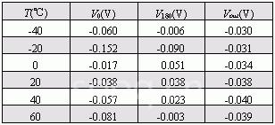 經(jīng)過對傾角傳感器自動調(diào)零原理的研究,設(shè)計并實現(xiàn)了自動調(diào)零伺服傾角傳感器樣機。為了驗證自動調(diào)零伺服傾角傳感器的自動調(diào)零和消除漂移特性,對此傾角傳感器進(jìn)行高低溫試驗。其溫度試驗結(jié)果如表1所示,其中V0和V180是內(nèi)部傾角傳感器在自動調(diào)零校正操作時在兩個測量位置直接讀取的,而Vout是調(diào)零校正后的計算結(jié)果(下同)。
