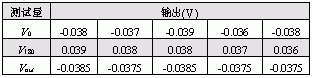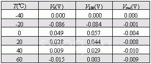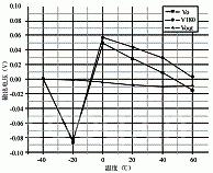 然后對結(jié)果進(jìn)行修正,用于對數(shù)據(jù)進(jìn)行分析,修正后的結(jié)果如表2所示??梢缘玫綔囟茸兓?輸出變化特性圖,如圖4所示。可以看出,在低溫-40℃到高溫60℃的溫度范圍內(nèi),內(nèi)部傾角傳感器的輸出V0具有最大為0.135V的溫度靈敏性。而當(dāng)經(jīng)過偏移校正后,傾角傳感器的輸出Vout具有最大為0.01V的溫度靈敏性。也就是說此傾角傳感器的零位溫度系數(shù)小于0.0001°/℃,其調(diào)零精度達(dá)到0.01°,達(dá)到了自動調(diào)零的目的,能夠滿足測試設(shè)備的要求。