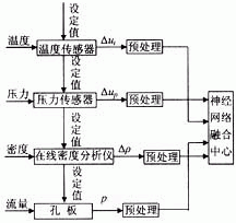 、和在線密度獲得介質(zhì)的實時特性信息,從而得到與孔板設(shè)計時設(shè)定的工作特性信息的偏差量;然后,將獲得的各種信息經(jīng)預(yù)處理后(、濾波、去噪,歸一化等),送入融合中心,融合中心采用神經(jīng)網(wǎng)絡(luò)的方法對數(shù)據(jù)進行融合處理。融合后的數(shù)據(jù)集中了4個傳感器的信息,極大的提高了孔板的測量精度。系統(tǒng)的配置結(jié)構(gòu)如圖1所示。