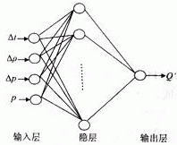 神經(jīng)網(wǎng)絡(luò)由輸入層、隱含層及輸出層組成。整個網(wǎng)絡(luò)的特性決定于相鄰層間神經(jīng)元的連接權(quán)及隱層中神經(jīng)元的閾值。在訓(xùn)練過程中,以孔板的輸出差壓p、介質(zhì)溫度、壓力和密度與設(shè)定的介質(zhì)溫度、壓力和密度的偏差量Δt、Δp、Δρ作為神經(jīng)網(wǎng)絡(luò)的輸入;輸出為介質(zhì)流量Q′,其值 最終將以某個允許偏差逼近被測介質(zhì)的實際流量Q。網(wǎng)絡(luò)結(jié)構(gòu)如圖3所示。
