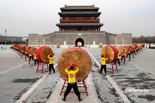 12月12日是氣候變化全球行動(dòng)日(GlobalDayofAction),國(guó)際環(huán)保組織綠色和平聯(lián)同北京20名鼓手,在北京古老的永定門城樓前擂響巨鼓,用震耳欲聾的鏗鏘鼓聲助威正在哥本哈根召開的全球氣候大會(huì)。鼓手們以中國(guó)傳統(tǒng)的擂鼓助威方式,通過凝重急促的鼓聲向全世界發(fā)出警告:“拯救氣候,刻不容緩”。