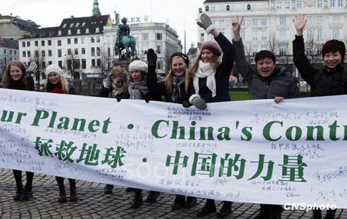 12月12日,正在丹麥哥本哈根召開的聯(lián)合國(guó)氣候會(huì)議舉行部分與會(huì)國(guó)會(huì)外會(huì)議,500多個(gè)來自70多個(gè)國(guó)家和組織的成員以及當(dāng)?shù)丨h(huán)保者6萬(wàn)多人匯集哥本哈根市貝拉會(huì)展中心進(jìn)行大游行。圖為在哥本哈根環(huán)保大游行醒目的中國(guó)“環(huán)保先鋒行活動(dòng)”。