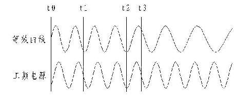 當(dāng)系統(tǒng)中的變頻器運行到50Hz時,并且經(jīng)過確認(rèn)需要向工頻切換時,軟切換裝置開始檢測工頻電源與變頻器輸出的相位,根據(jù)調(diào)試時的設(shè)定,同時變頻器根據(jù)調(diào)試時的設(shè)定升高一定的頻率,頻率到達(dá)后系統(tǒng)再向軟切換裝置發(fā)出切換命令。軟切換裝置在得到系統(tǒng)發(fā)出的切換指令后,捕捉到同相位時刻前的設(shè)定時刻時,命令系統(tǒng)斷開接觸器KM2,接通接觸器KM3。兩接觸器之間是互鎖的,但兩者之間并沒有人為的延時,得到的切換命令是同時的。