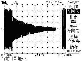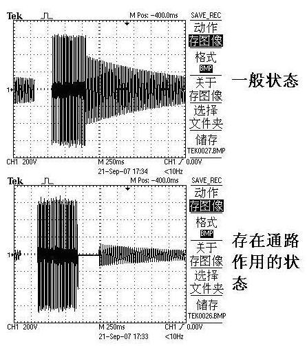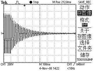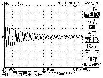 由于變頻器輸出的是PWM波,其相位不易觀察,測得在工頻狀態(tài)下的電壓波形進(jìn)行進(jìn)一步的分析。因為變頻器50Hz時的輸出電壓與工頻電壓作用在電機(jī)上基本時等效的,并不影響分析結(jié)果。圖4是一2.2KW電機(jī)在工頻電源下突然斷開電源后的電壓波形圖,由該圖可以看出,電壓波形沒有跳變,所以斷開瞬間感應(yīng)電動勢與電源電壓是同相位的,其幅值也是基本相等的。隨著剩磁的慢慢消失,電壓幅值逐漸降低,同時伴隨著轉(zhuǎn)速的降低感應(yīng)電動勢的頻率逐漸下降,其相位也逐漸與電源相位拉開。頻率越低,單位時間內(nèi)拉開的相位差也就越大。