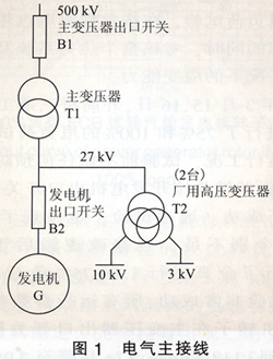 為提高機組運行的靈活性,與二期無GCB不同,三期的2臺發(fā)電機均配置了GCB,但不設高壓備用變壓器。在發(fā)電機未投入時(GCB斷開),l0kV/3kV廠用電可直接通過主變壓器/廠用高壓變壓器取自500kV電網(wǎng)(見圖1)。因此,三期的運行和連鎖方式與二期有所不同,當機組運行中斷開Bl時,發(fā)電機通過T2帶廠用電運行,即FCB工況。而當斷開B2時,則由500kV線路側通過Bl、Tl向T2供廠用電,因此,主變壓器出口開關Bl不參與機、電、爐連鎖跳閘。