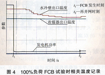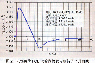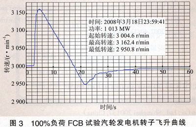 按三期的設計,汽輪發(fā)電機甩負荷時,鍋爐通過旁路系統(tǒng)維持運行,從熱力系統(tǒng)角度,其工況變化與FCB時最相似,甚至更極端。兩者不同之處在于廠用電的供電方式,甩負荷時廠用電由電網(wǎng)倒送,相對較安全,因此在進行FCR試驗前,應先完成全真運行工況的甩負荷試驗,在按常規(guī)測取汽輪發(fā)電機轉子飛升轉速的同時,考核整個熱力系統(tǒng)及相關控制系統(tǒng)在此工況下的應變能力。