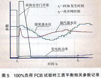 根據(jù)記錄,再熱安全門在FCB發(fā)生后的13s快速開啟,經(jīng)28s后開始逐漸調節(jié)關小,再經(jīng)48s后完全關閉。從圖5中可看出,因包括逐步關閉過程在內的總開啟時間短,工質損失少,所以對凝汽器水位造成的影響很小,從而驗證了三期工程就改善FCB過程工質平衡的一系列措施非常有效。