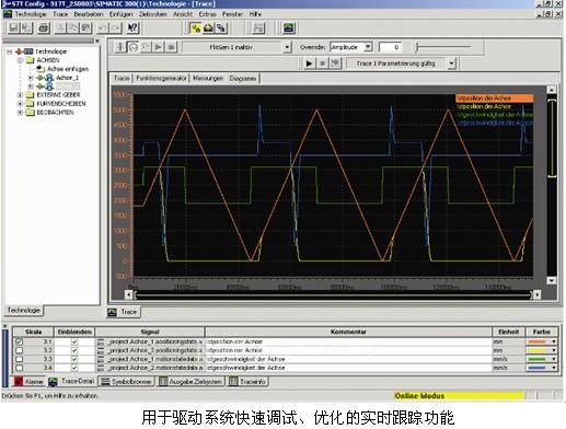 為能方便進行調(diào)試診斷,除了通常的 SIMATIC 診斷功能以外, S7-Technology 還提供有一個控制面板和實時跟蹤功能。這可顯著減少系統(tǒng)的調(diào)試和優(yōu)化時間。
